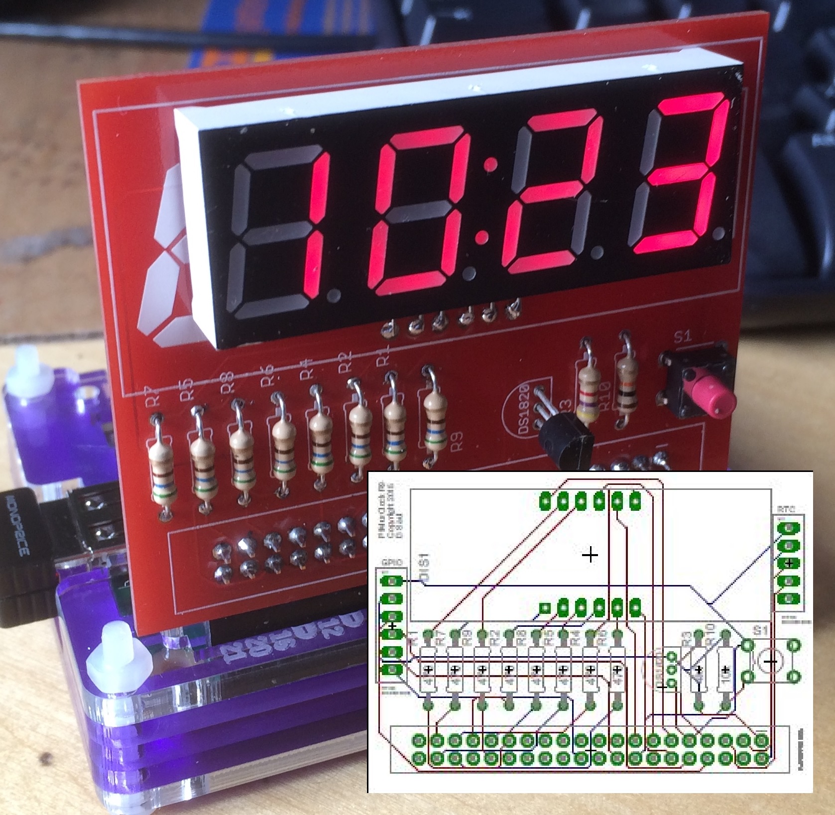 time clock board – because the Rpi does not have its own battery backed clock it relies on connecting to internet at power up to ensure the Linux System time is correct, adding the DS1307 board gets around this. Finally the production design will also include a second rear connector providing access to a number of unused GPIO lines, creating more possibilities for extensions to the basic clock project.