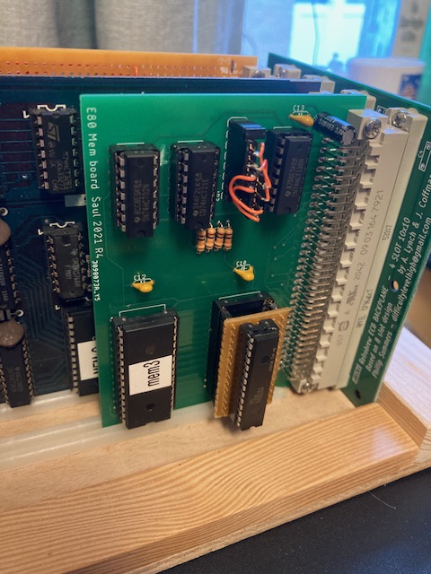 With the memory PCB due I got around to ordering the memory chips, as you can see from the picture on the right I showed my age by missing that a lot of 28 pin devices are in a narrow format these days, hence the adaptor ! Functionally the board worked first time, there were a few bits I would change but nothing to drive a new pcb order. With the board working I now had around 30K of usable RAM, 2K monitor space and 8K (or16K) read only memory at the top of the 64K map.