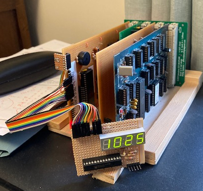 As currently configured every minute the RTC creates a Z80 interrupt which sets off an update of each clock digit to via the PIO. The PIC drives the multiplex display as a background routine with each PIO update causing a PIC interrupt to refresh the clock digit data. The net result is there is almost no additional load on the Z80 and I have a clock on my desk.