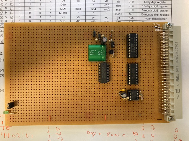 With a 3+ week turnaround for the PCB I was wondering what other feature I could usefully add and landed on including a real time clock capability. Existing RTC addon’s for Z80 boards seemed to use use I2C modules, but not wanting to implement I2C I opted for a older EPSON RTC the 72421, that I could tie directly in to Z80 IO ports. I could have gone down the route of using a RAM chip module with a build in RTC and battery but this would have meant memory mapping the clock IO which is a bit of waist given separate IO space is key Z80 feature over say a 6502. The 72421 is relativity easy to implement. The only real complexity was sorting out the battery back-up. Newer RTC’s provide a bit more help here but are much harder to find in old school dual in line packages. In the end I opted for a super capacitor over a rechargeable battery. The back-up time is only about 24 hours – still more than enough for this application. The picture on the left shows the completed RTC board, with a bit of room for maybe something else in the future. I have extended the monitor s/w to include routines to read the clock, which because of the all the text involved ended up taking most of spare room in the 2K address space.