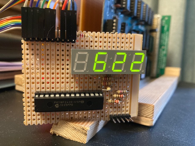 One of the reasons for adding the RTC was so the computer could sit on my work desk as a slightly over sized clock. The plan at the time was to use some sort of retro display type to compliment the age to the Z80 board. The trouble with this is that it would tie the processor up with driving a multiplex display not leaving much time it to do anything else. Coincidentally around this time I had an idea for another project which will need me to move data directly from a Z80 bus to a PIC. As a proof of concept for this I pulled together a simple 4 digit LED display driven from and 18F series PIC. Initially this is being driven via the a Z80 PIO port, the next stage will be to change it to connect directly to the processor data bus.